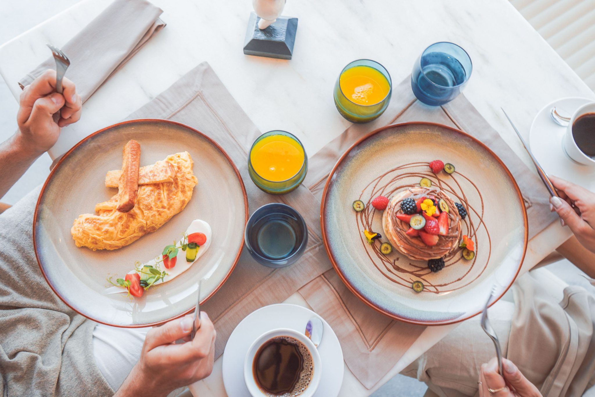 Відповідно до філософії грецької гастрономії шеф-кухар та його команда створили два меню: одне, яке подається протягом дня, та спеціальне меню на вечерю. Обидва меню наповнені вишуканими уподобаннями, які обов’язково варто спробувати всім любителям їжі.