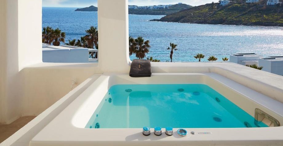 Junior Suite (Garden View) з джакузі – 30–35 м², до 3 дорослих. Пориньте у світ розкоші та вишуканої елегантності. Номери пропонують спокійний та просторий відпочинок, майстерно поєднуючи традиційну міконську архітектуру з елементами сучасного дизайну. Кожен люкс включає власну гідромасажну ванну просто неба, створюючи ексклюзивний затишок для відпочинку та насолоди.