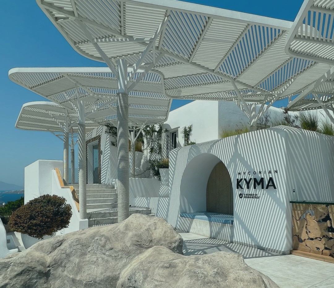 Myconian Kyma – бутик-готель категорії 5*, що ідеально підійде для пар, поціновувачів гастрономії, wellness-відпочинку та стильних подорожей. Виконаний у стилі сучасної інтерпретації кикладської архітектури з використанням натуральних матеріалів та білосніжних фасадів. Розташування дозволяє поєднати тишу та приватність із близькістю до нічного життя Міконосу. Готель оцінять любителі розваг, художники, шукачі пригод будь-якого віку. Входить до колекції Design Hotels.