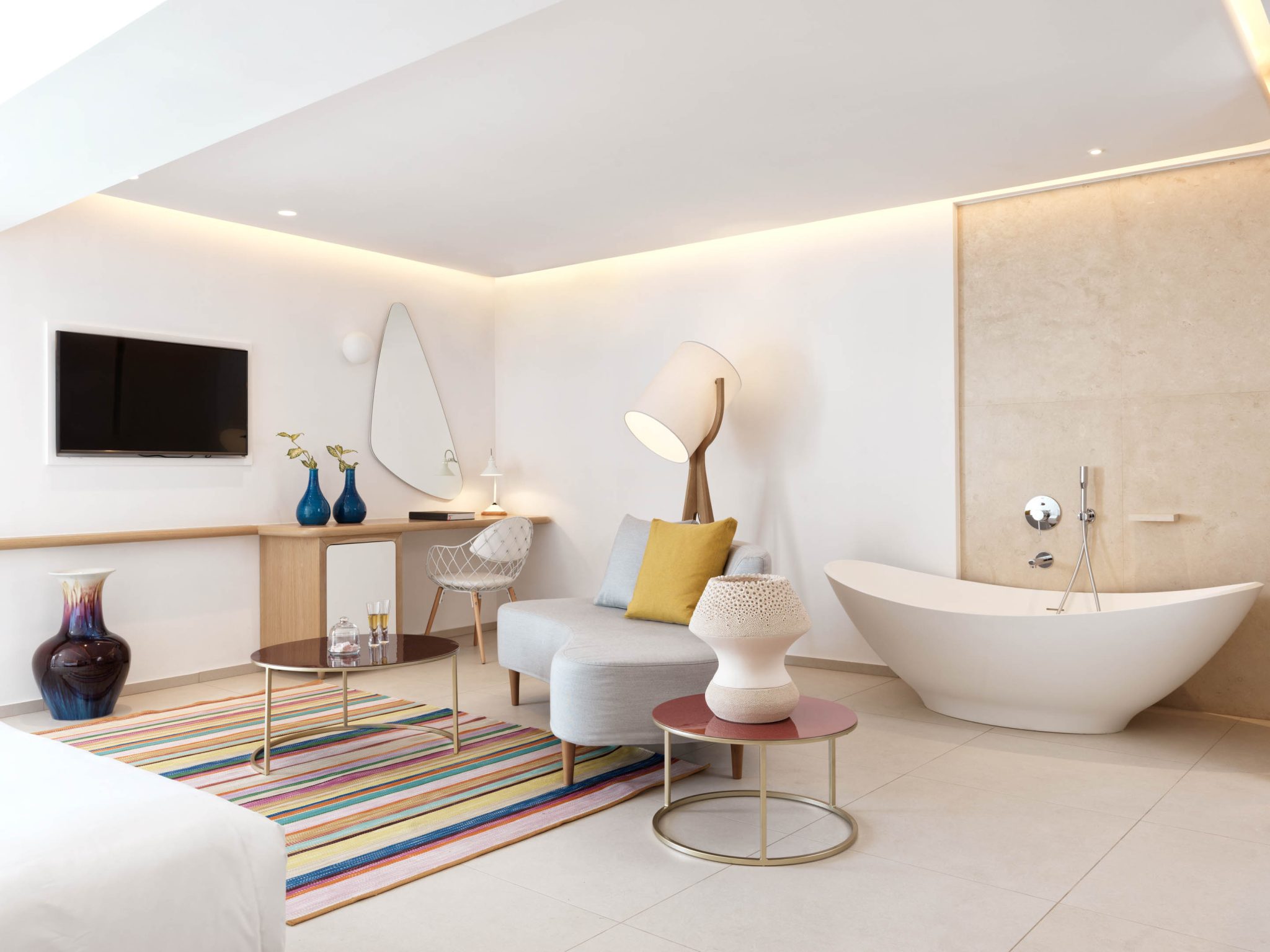 У Myconian Kyma кожен номер і люкс – це святилище кікладської елегантності та сучасної розкоші. Залиті сонцем інтер’єри вирізняються натуральними текстурами, меблями на замовлення та мінімалістичною естетикою, що відображає красу острова.